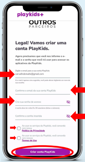 Cadastre seu e-mail e senha, concorde com os termos de uso do app e clique em “Criar conta PlayKids”.